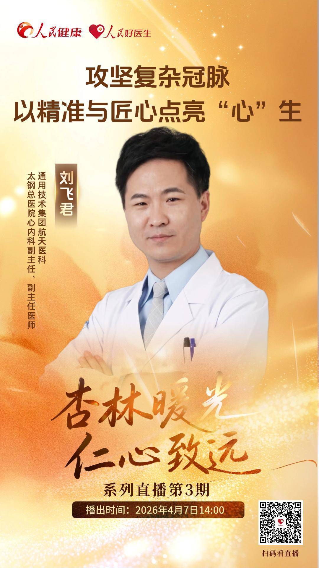 急性心肌梗死发病急、病情重,每一分钟的延误都可能危及生命,而复杂冠心病的救治更是对医疗技术、团队协作与应急能力的多重考验。针对急性心梗等急症,如何通过流程优化、多环节衔接与资源整合,确保患者在黄金时间内获得精准高效的救治?年轻医生除专业技术锤炼外,哪些核心素养最为关键?4月7日14:00,通用技术集团航天医科太钢总医院心内科副主任、副主任医师刘飞君做客直播间,分享医者的坚守与担当,敬请关注。