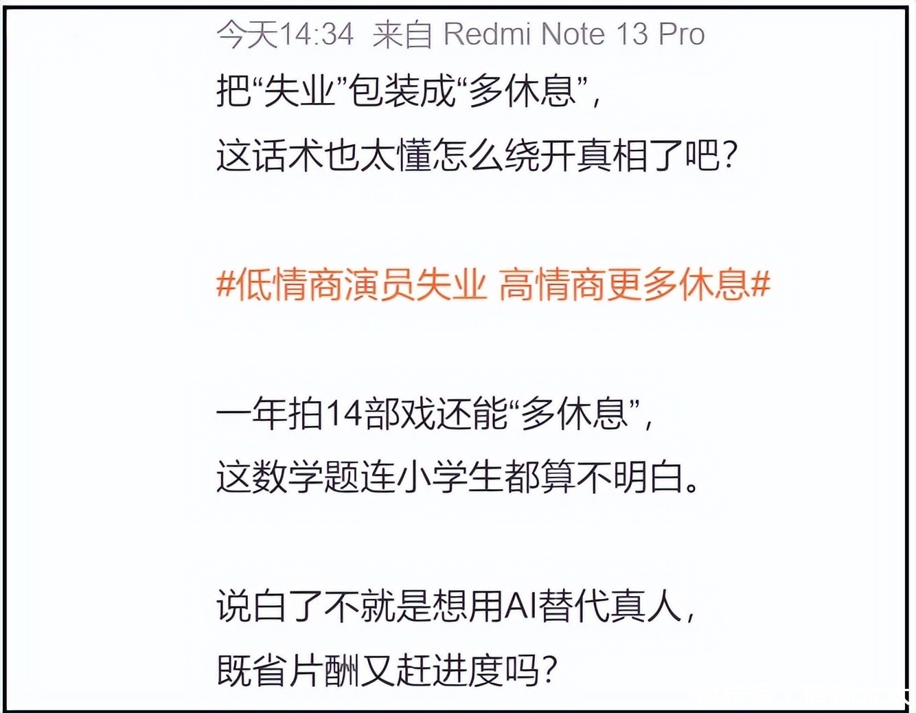 另外,不得不提的是,不少网友都开始抵制ai演员了,相关话题讨论度越来越高,已然形成风波,还有了升级趋势。