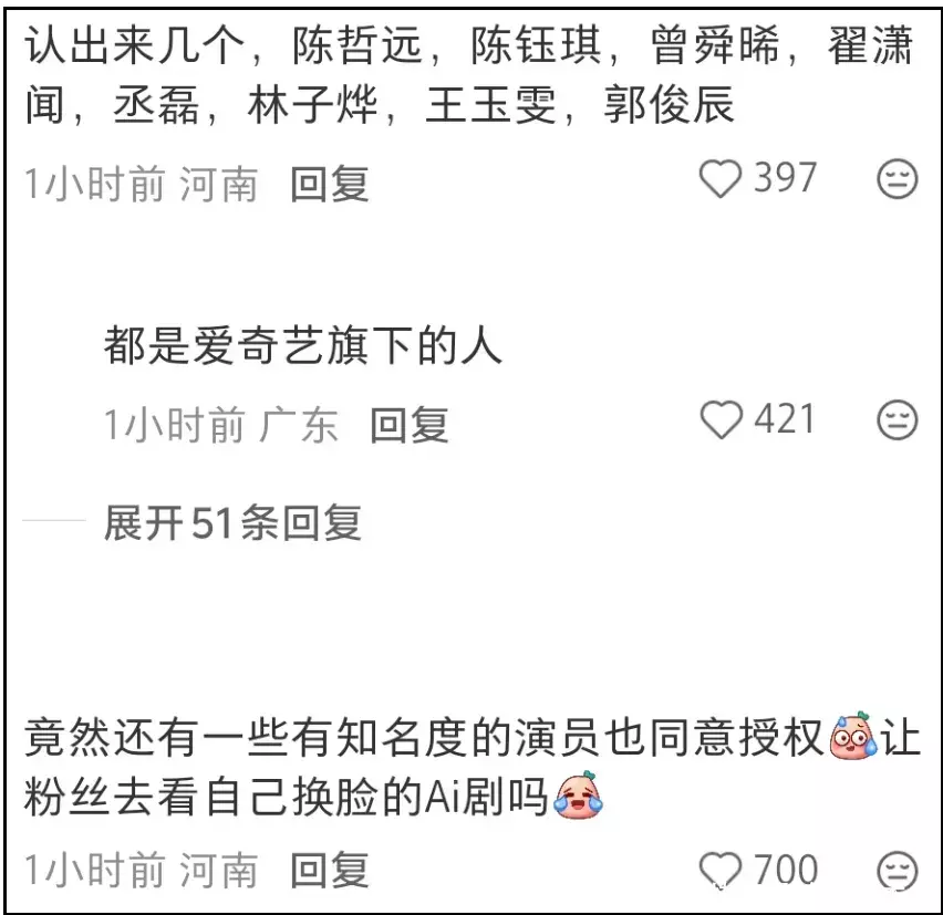 像陈哲远、丞磊、曾舜晞、翟潇闻等人,属于二三线演员——暂时还没有当红顶流授权ai呢。