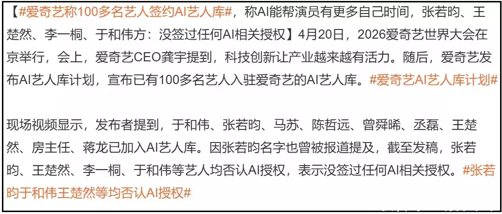 张若昀、王楚然、李一桐、陈哲远、于和伟等明星都通过工作室或粉丝对接对外强调没有签约任何ai影视授权。